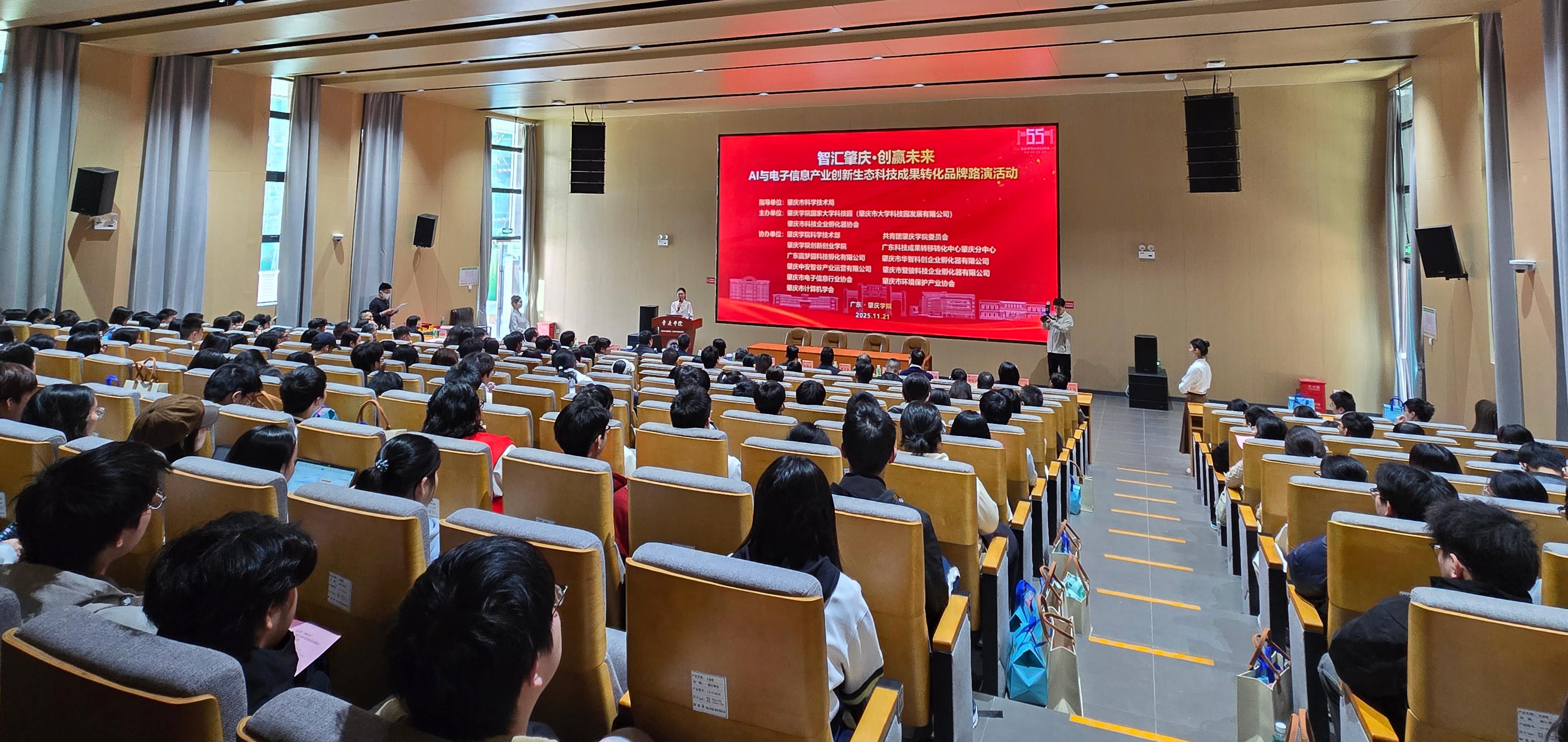 本网讯 11月20日,在肇庆市科学技术局指导下,由我校国家大学科技园、肇庆市科技企业孵化器协会联合主办,我校科学技术部、团委、创新创业学院等协办的“智汇肇庆·创赢未来——AI与电子信息产业创新生态科技成果转化品牌路演活动”在我校新校园报告厅举办。肇庆市科技局副局长叶护华,我校副校长李新昌、国家大学科技园管委办主任肖俊霞、科学技术部副部长杨国杰,以及来自政府、高校、企业、协会、金融机构代表250余人参加本次活动。
